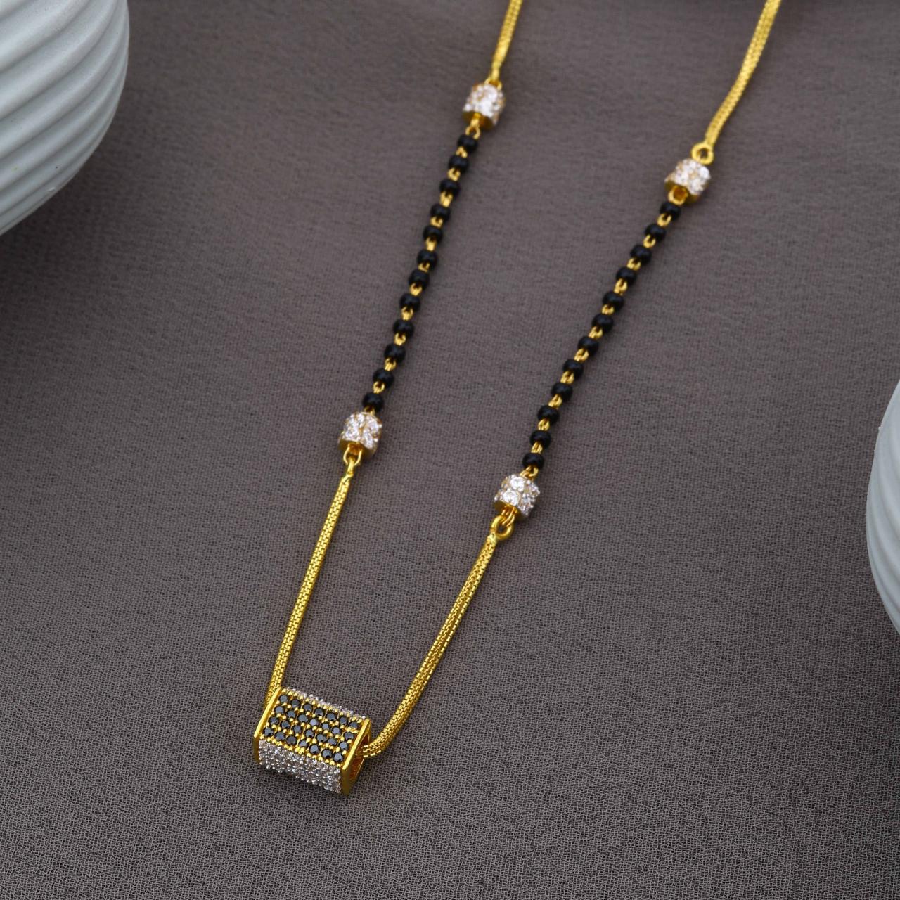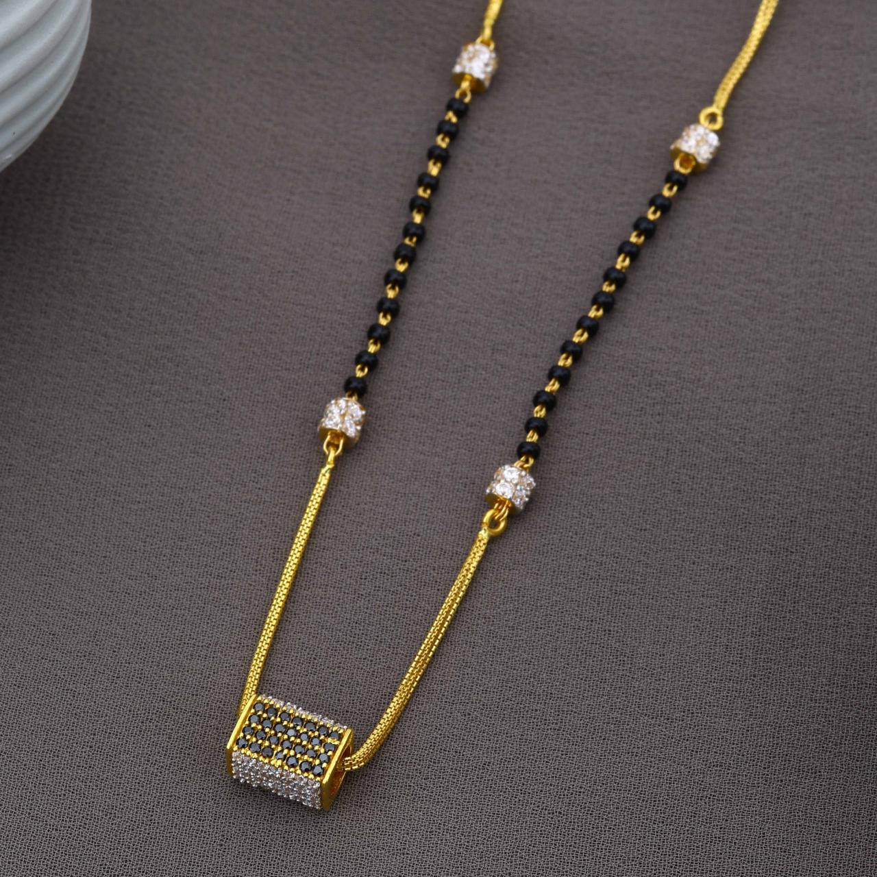 Description: This avant-garde 22KT gold Mangalsutra features a striking rectangular block pendant. The pendant is meticulously paved with deep black stones on its face, bordered by shimmering white stones for a sharp, modern contrast. The design is seamlessly integrated into a traditional black bead chain, further accented by stone-studded barrel motifs that add a luxurious rhythmic flow to the piece.