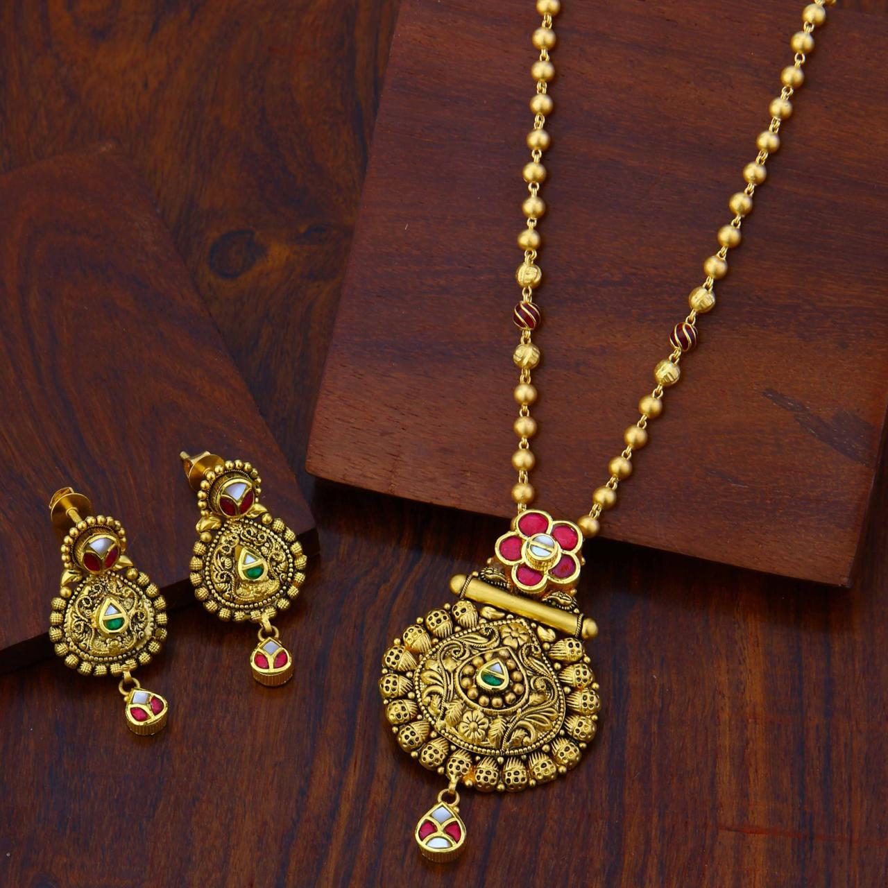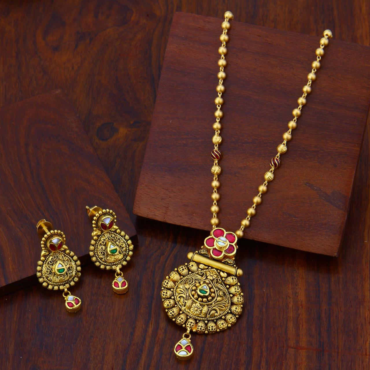 Description: This exquisite antique-finish jewelry set includes a matching necklace and drop earrings adorned with intricate traditional craftsmanship. The central pendant features a finely detailed floral medallion with a textured gold base, accented by vibrant red and green enamel work and white stone inlays. The set is completed with a classic gold bead chain and matching earrings, each finished with an elegant enamel droplet. 100% Hallmark (HUID) Guaranteed | BIS Approved.
