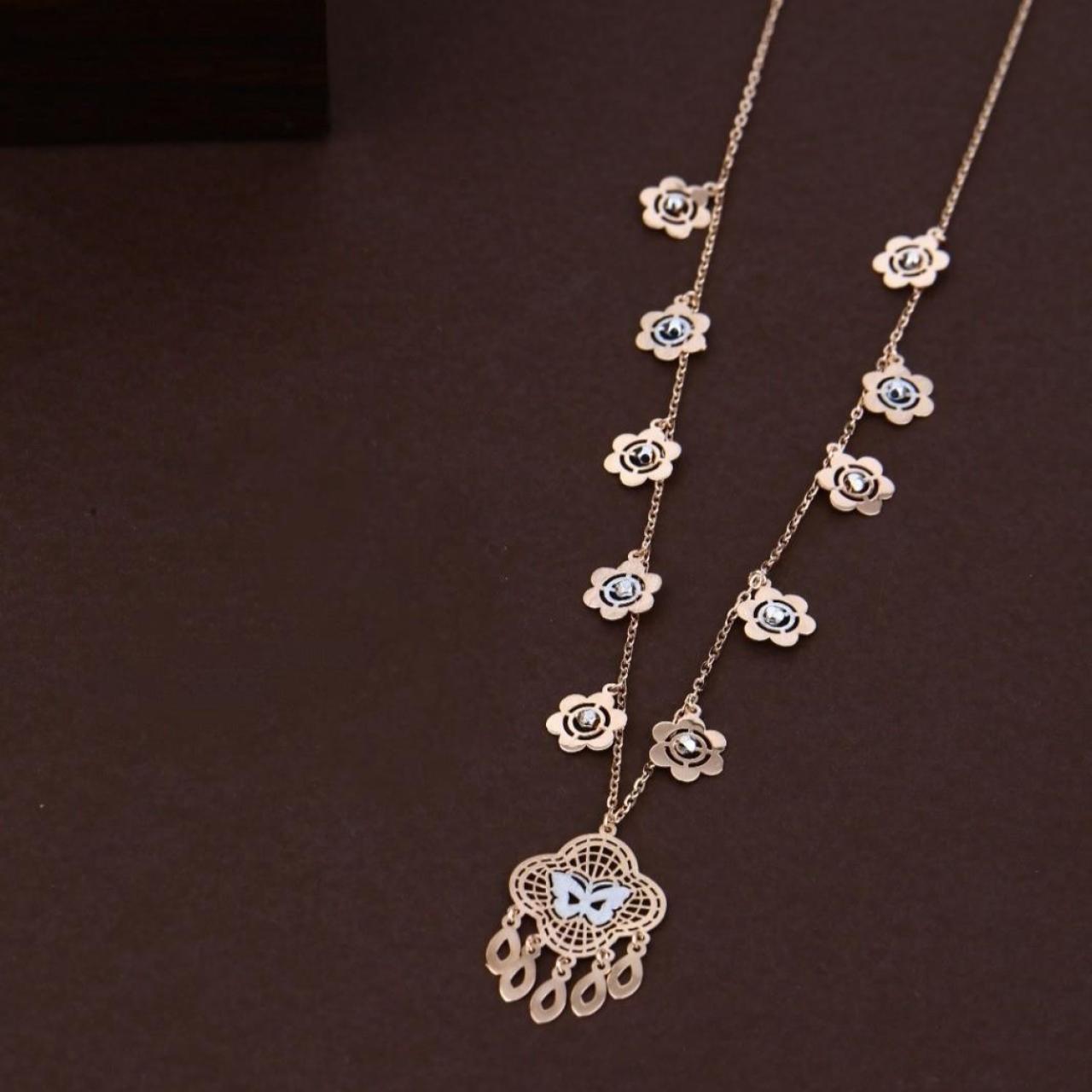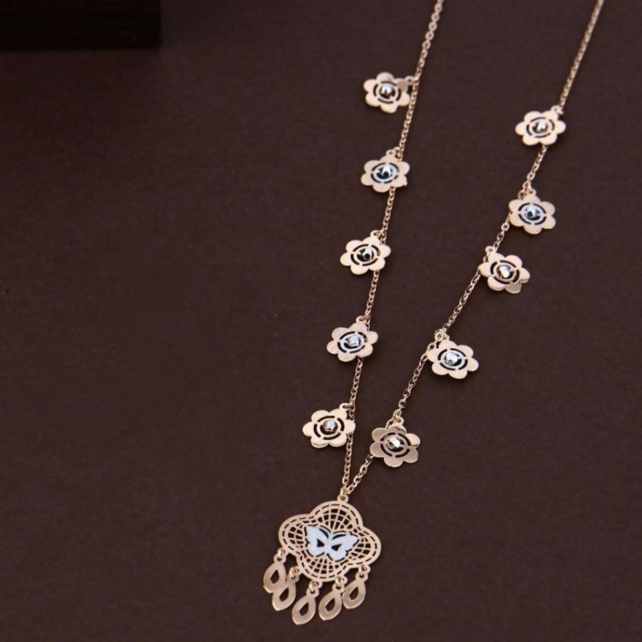 Yeh ek sundar rose gold dokiya hai jisme chain par floral charms lage hain aur beech mein ek stylish butterfly pendant hai. Is butterfly pendant mein barik lattice (jaali) work aur chamakdar stones ka upyog kiya gaya hai jo ise ek elegant look deta hai. 100% Hallmark guaranteed BIS Approved