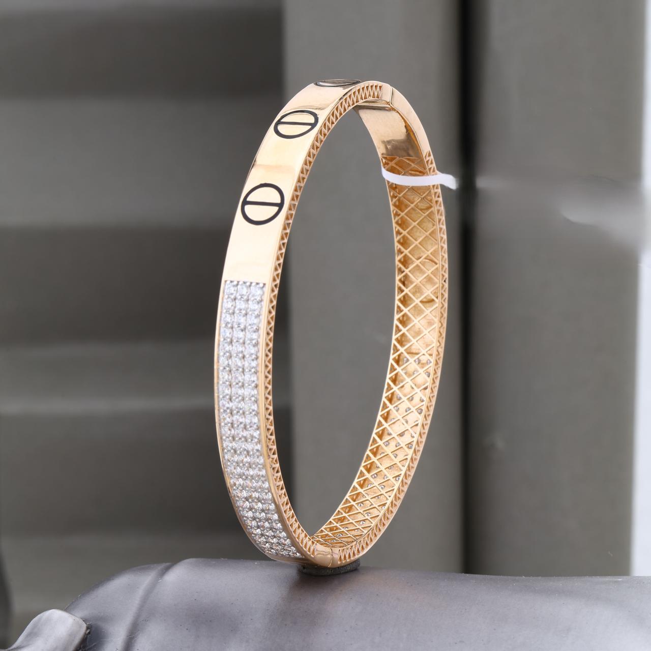 Ye ek premium gents kada hai jisme "Two Tone" finish di gayi hai. Is par Cartier-inspired design motifs bane hain aur ek hisse par sparkling stones ka dense work kiya gaya hai, jo ise ek luxury look deta hai. Kada ke andar ki taraf lattice (jaali) work design hai. 100% Hallmark guaranteed BIS Approved