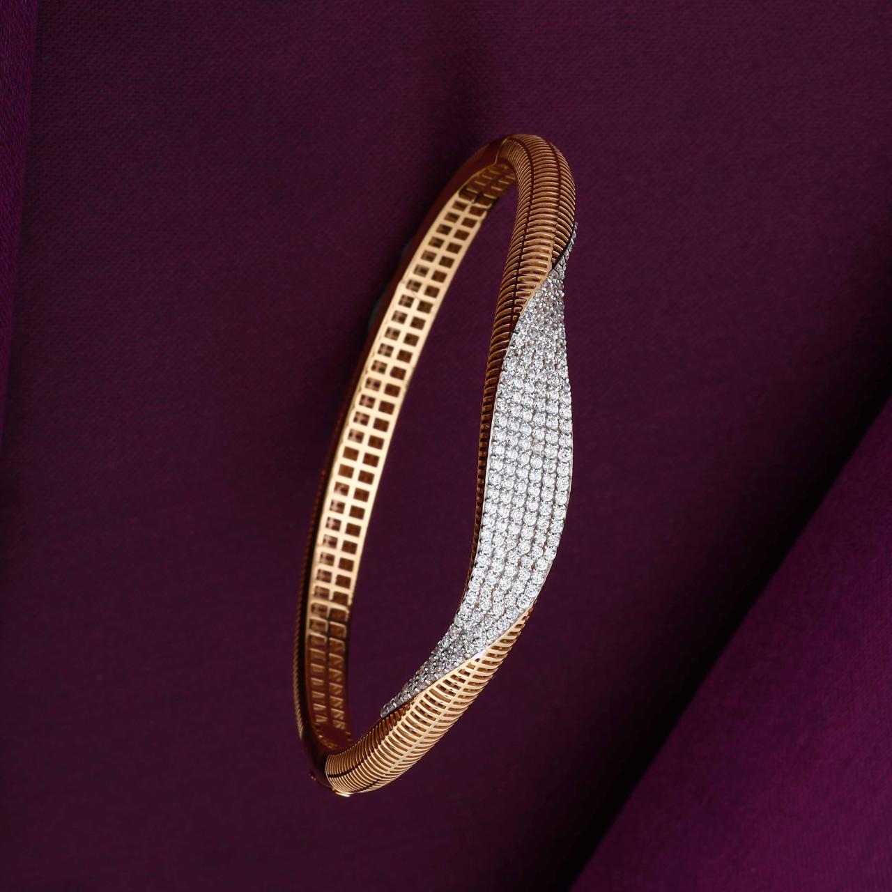 Description: This statement 18KT gold kada features a bold, wide band with a distinctive contoured wave design at the center. The central wave is elegantly pavé-set with a dense field of shimmering diamond-style stones. The gold sections of the band are finished with a fine, horizontal ribbed texture, while the interior is reinforced with a clean rectangular lattice for structural strength and a premium finish.