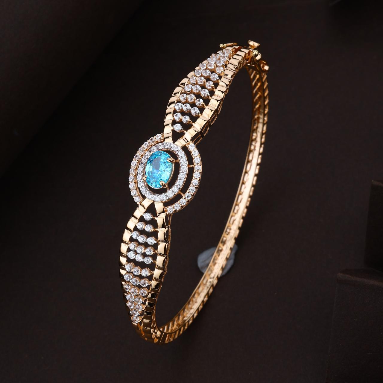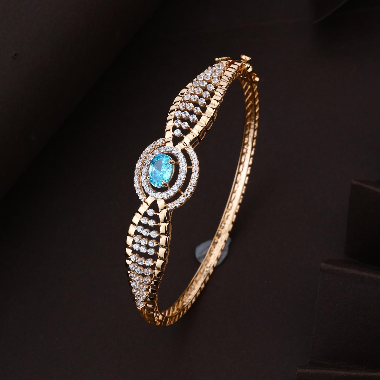 A magnificent gold-toned kada bracelet featuring a bold, ornate design. The centerpiece showcases a brilliant oval-cut blue stone encircled by a shimmering halo of white accents, flanked by intricate lattice-style bands encrusted with multiple rows of sparkling stones for a truly regal look. 100%Hallmark guaranteed BIS Approved