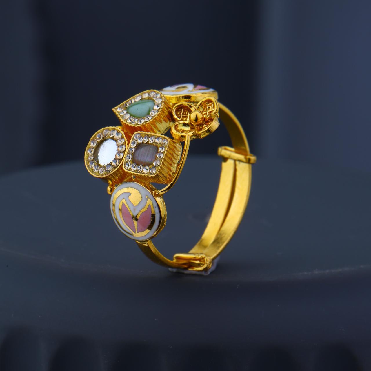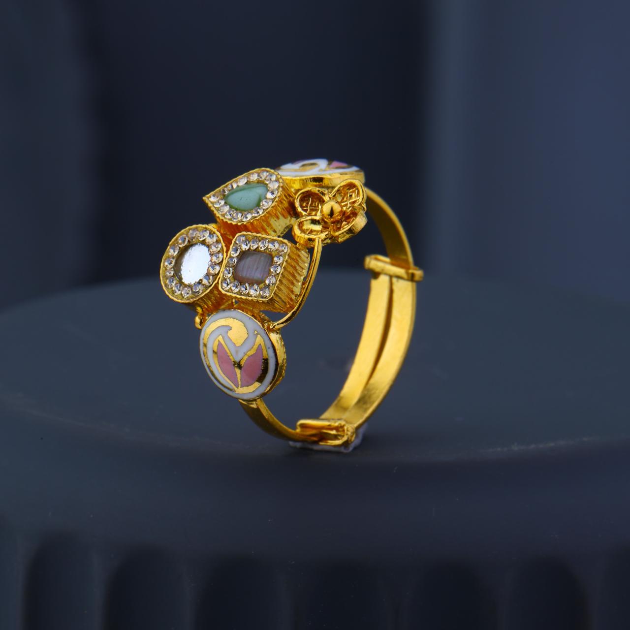 Discover a stunning antique-style 22k gold ring featuring a bold, ornate design perfect for special occasions. This unique statement piece incorporates various colourful gemstones, including what appear to be mother-of-pearl, pink, and green enamel or stones, set in a rich, textured gold band.