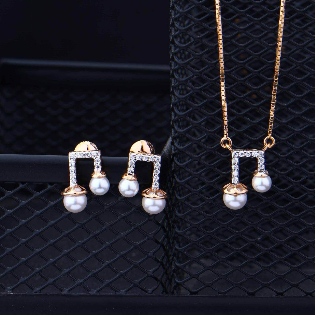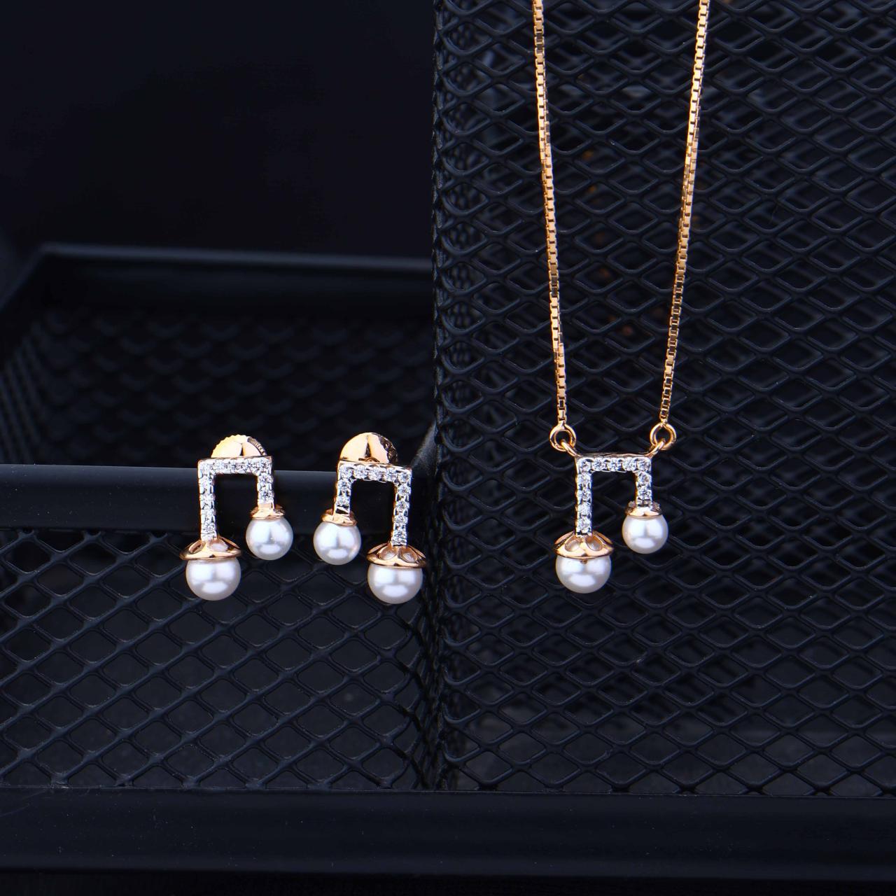 This elegant jewelry set features a matching pendant and earrings designed in the shape of musical notes. Crafted in rose gold, the pieces are accented with sparkling stones and delicate white pearls at the base of each note. 100% Hallmark guaranteed BIS Approved
