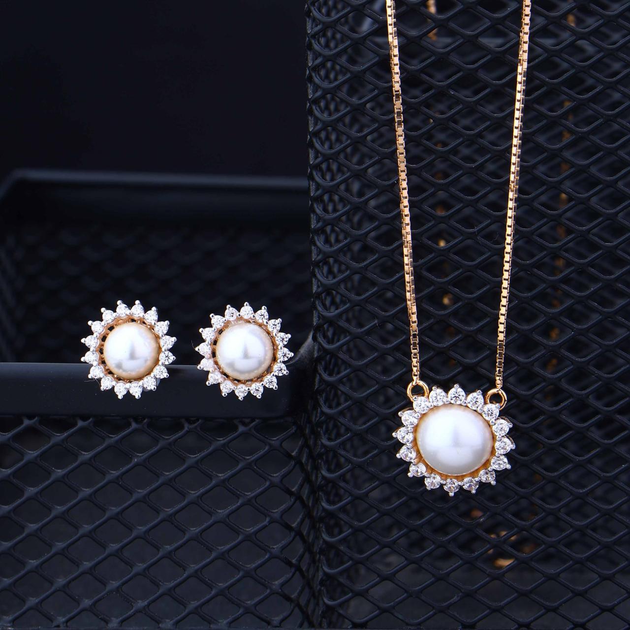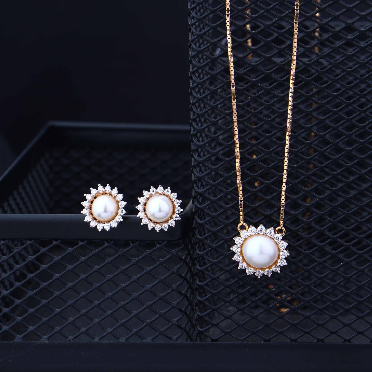 This elegant jewelry set features a matching pendant and stud earrings designed with a classic halo aesthetic. Each piece centers on a large, lustrous white pearl surrounded by a brilliant sunburst cluster of sparkling white stones. The pendant is suspended from a sleek gold box chain, while the earrings provide a perfectly coordinated look. The craftsmanship blends traditional elegance with a radiant, modern finish.
