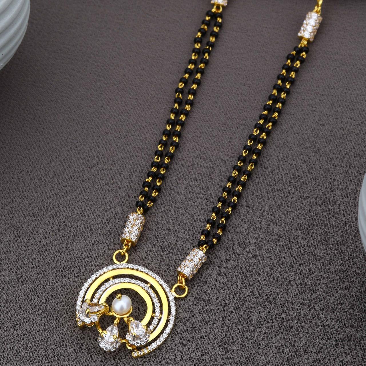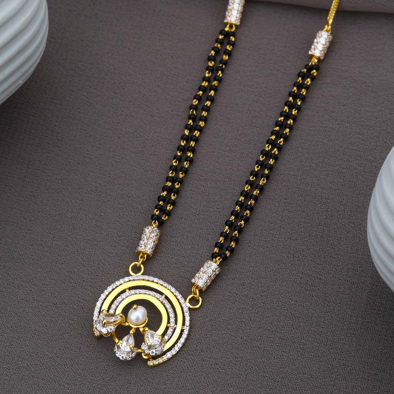 Description: This refined 22KT gold Mangalsutra features a stunning triple-arch pendant. The design is centered around a delicate white pearl, with the outer arches encrusted in shimmering white crystals and accented by three hanging pear-shaped stones. It is paired with a double-layered black bead chain and stone-studded cylindrical gold spacers for a luxurious, modern finish.