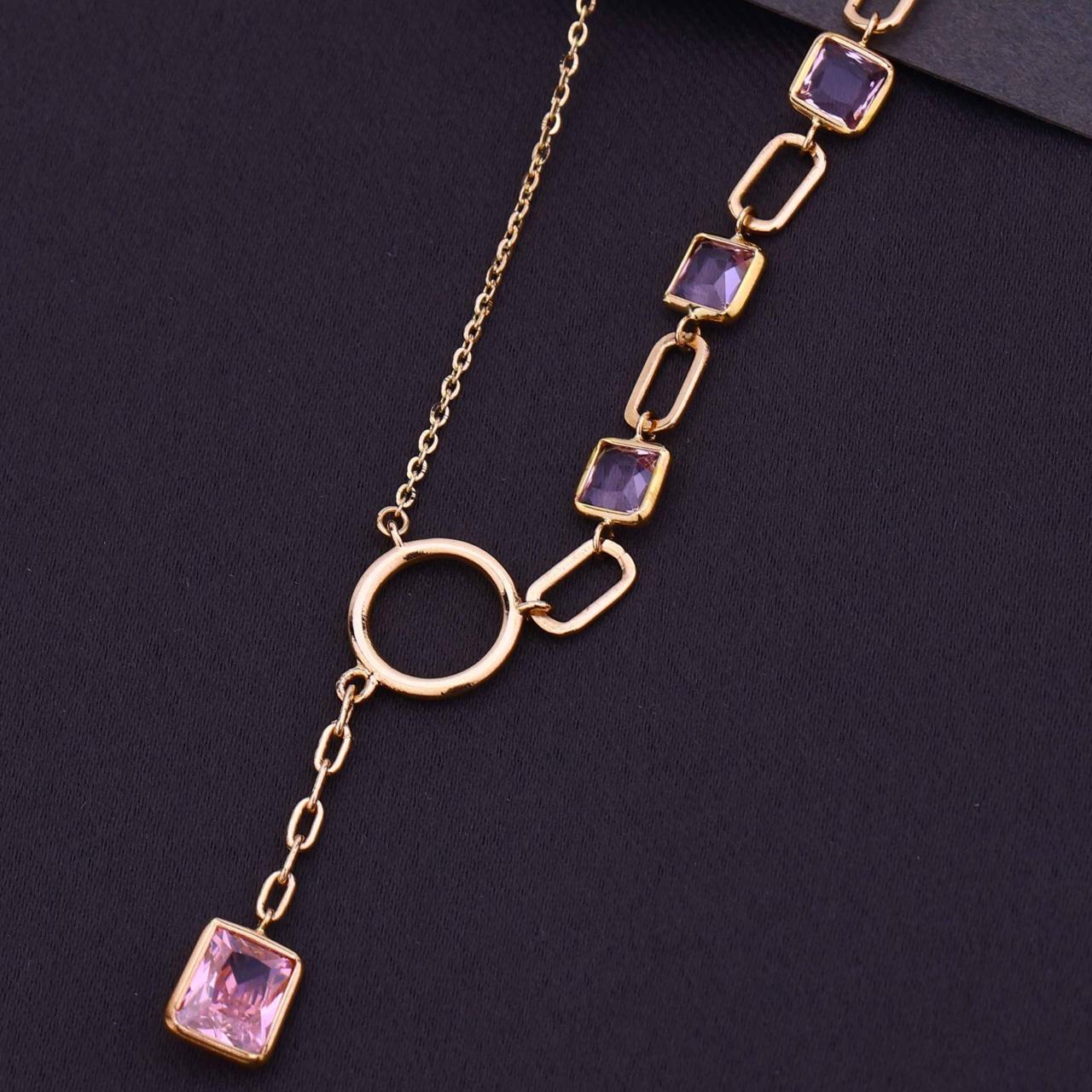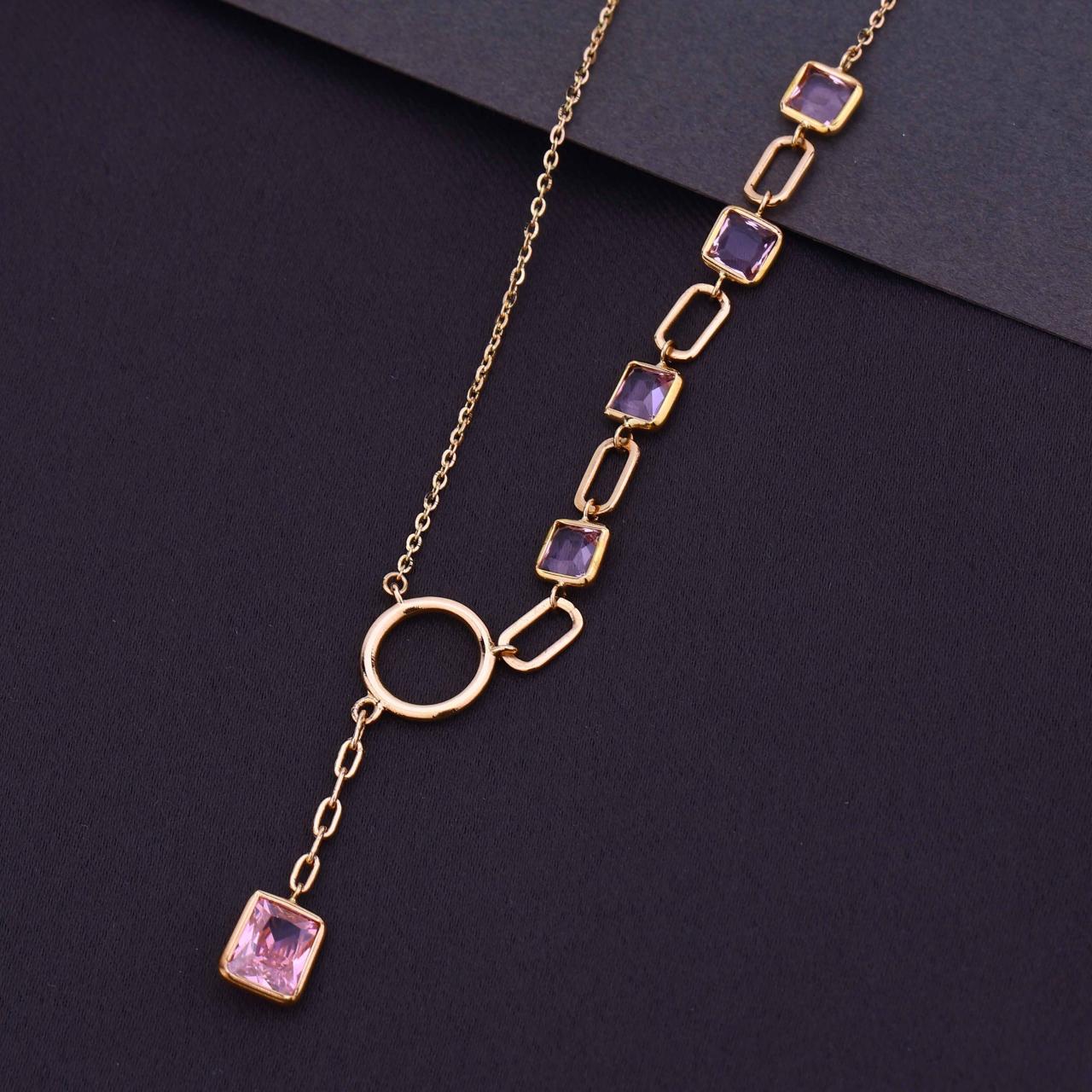 An elegant rose gold lariat-style necklace featuring a sequence of square-cut amethyst-colored stones and gold links. The drop is finished with a stunning pink stone pendant, making it a sophisticated statement piece for contemporary styling. 100% Hallmark guaranteed BIS Approved