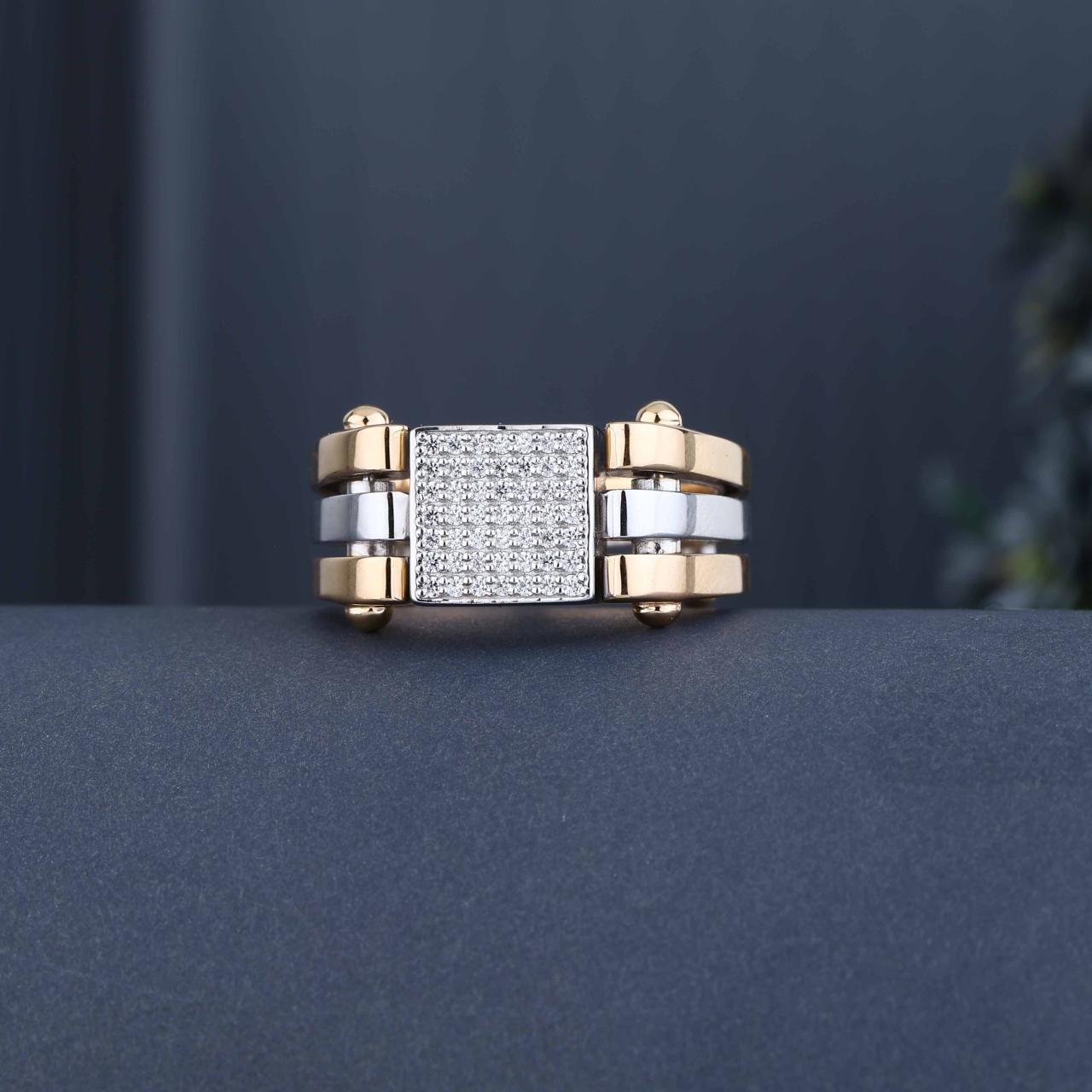 A bold men’s ring featuring a square cluster of finely set stones that create a rich, diamond-studded look. The dual-tone gold and white metal band with layered design adds a strong and luxurious appeal—perfect for statement wear and premium styling. 100%Hallmark guaranteed BIS Approved