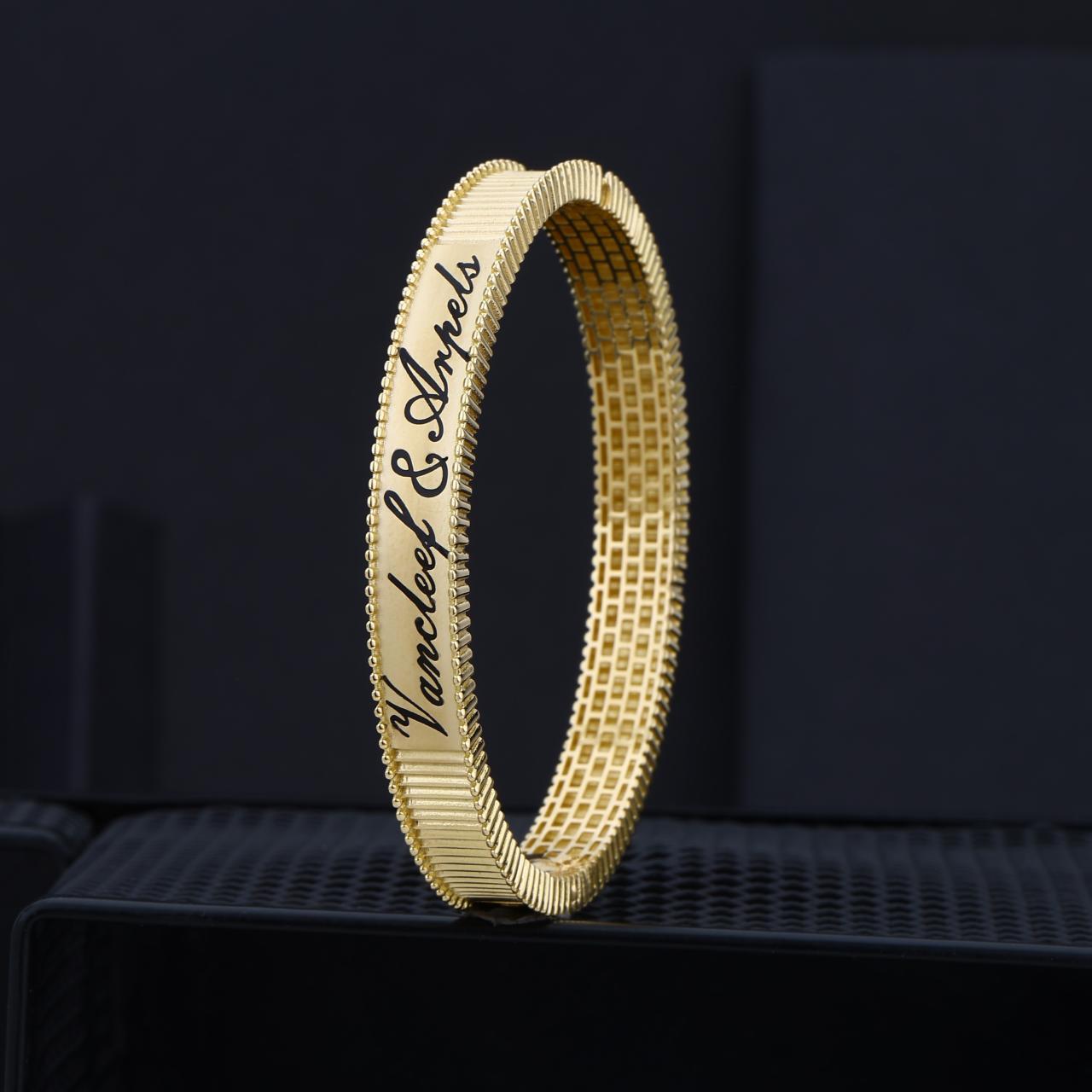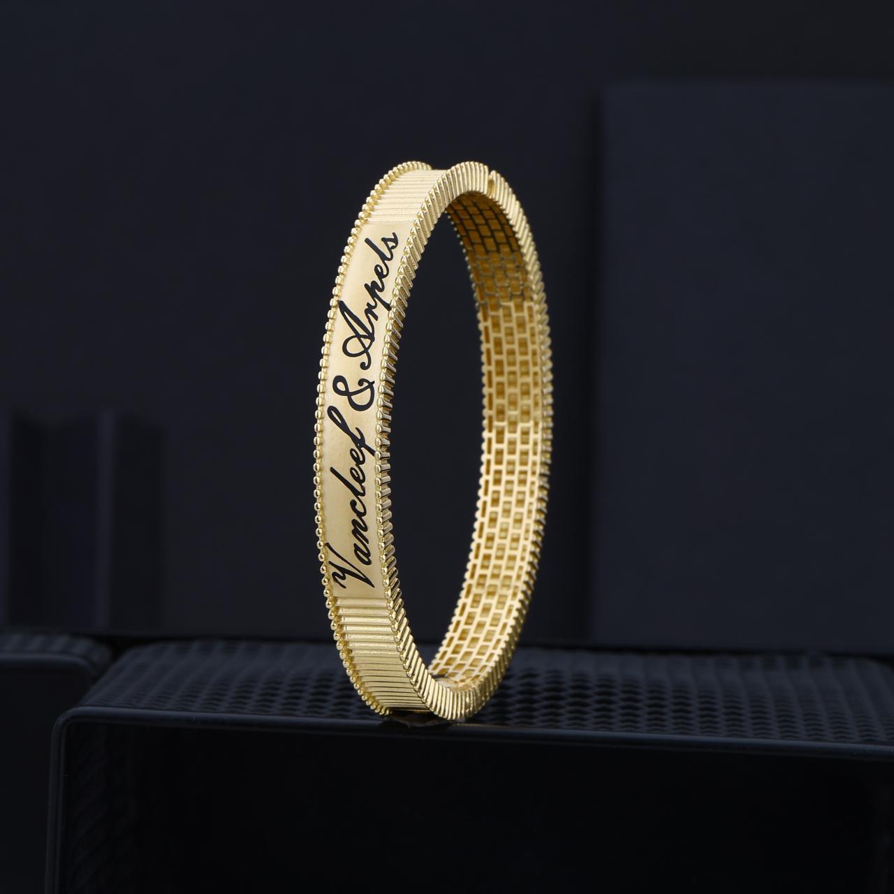 This premium gold bangle features a bold, structured design with a distinctive beaded edge. The outer surface is engraved with "VanCleef & Arpels" in an elegant script, while the interior showcases an intricate lattice or honeycomb pattern. It is a sophisticated, high-polished piece that combines classic branding with modern architectural detail.